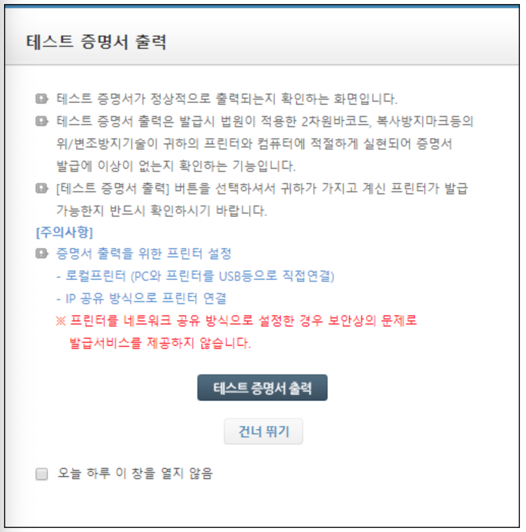 5. 페이지 방문시 위와같은 화면이 나옵니다. 프린트 작동여부 확인후 [테스트증명서출력] 합니다. 필요없는경우 [건너뛰기] 무방합니다.