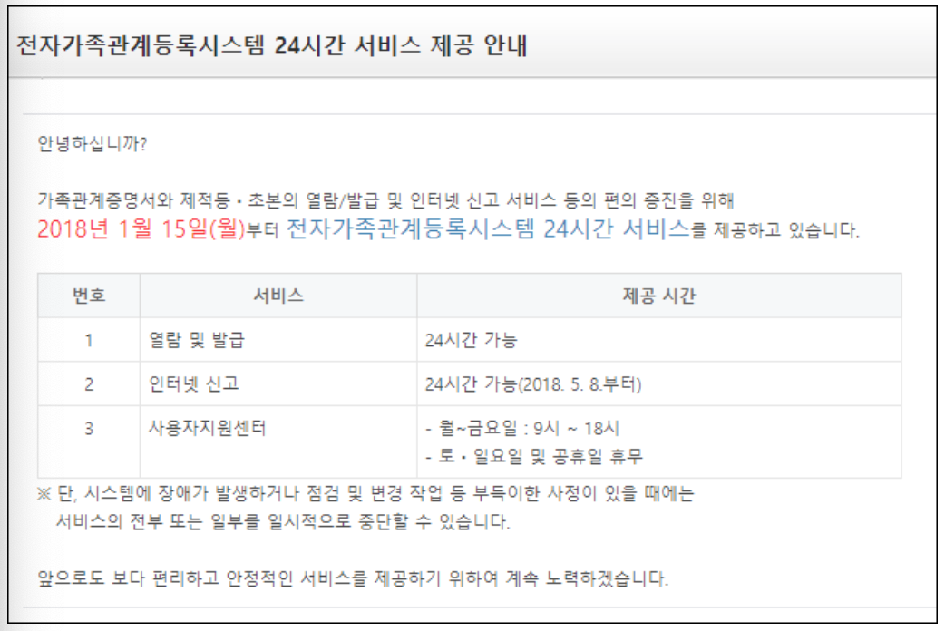 6. 가족관계 증명서 발급은 2018년 1월 15일부터 24시간 이용 가능 합니다. 하지만 사용자지원센터는 평일기준 9~18시 주말 은 휴무 입니다. 참고 하세요.
