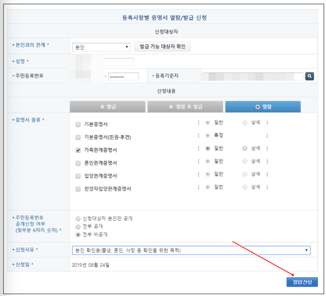 8. 가족관계 증명서 인터넷발급 무료서비스 항목 체크후 [열람신청] 클릭