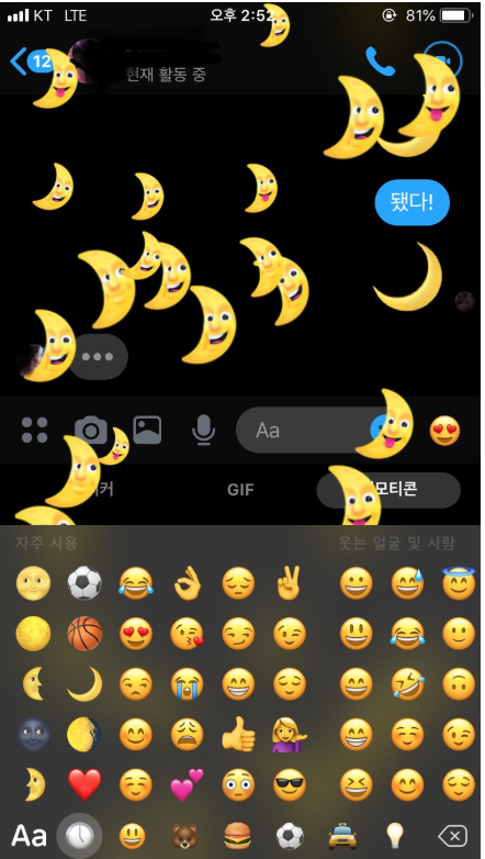페북 메신저 이모티콘 탭에 보면 많은 이모티콘이 보이는데 이중 [민무늬초승달] 을 찾아 줍니다.